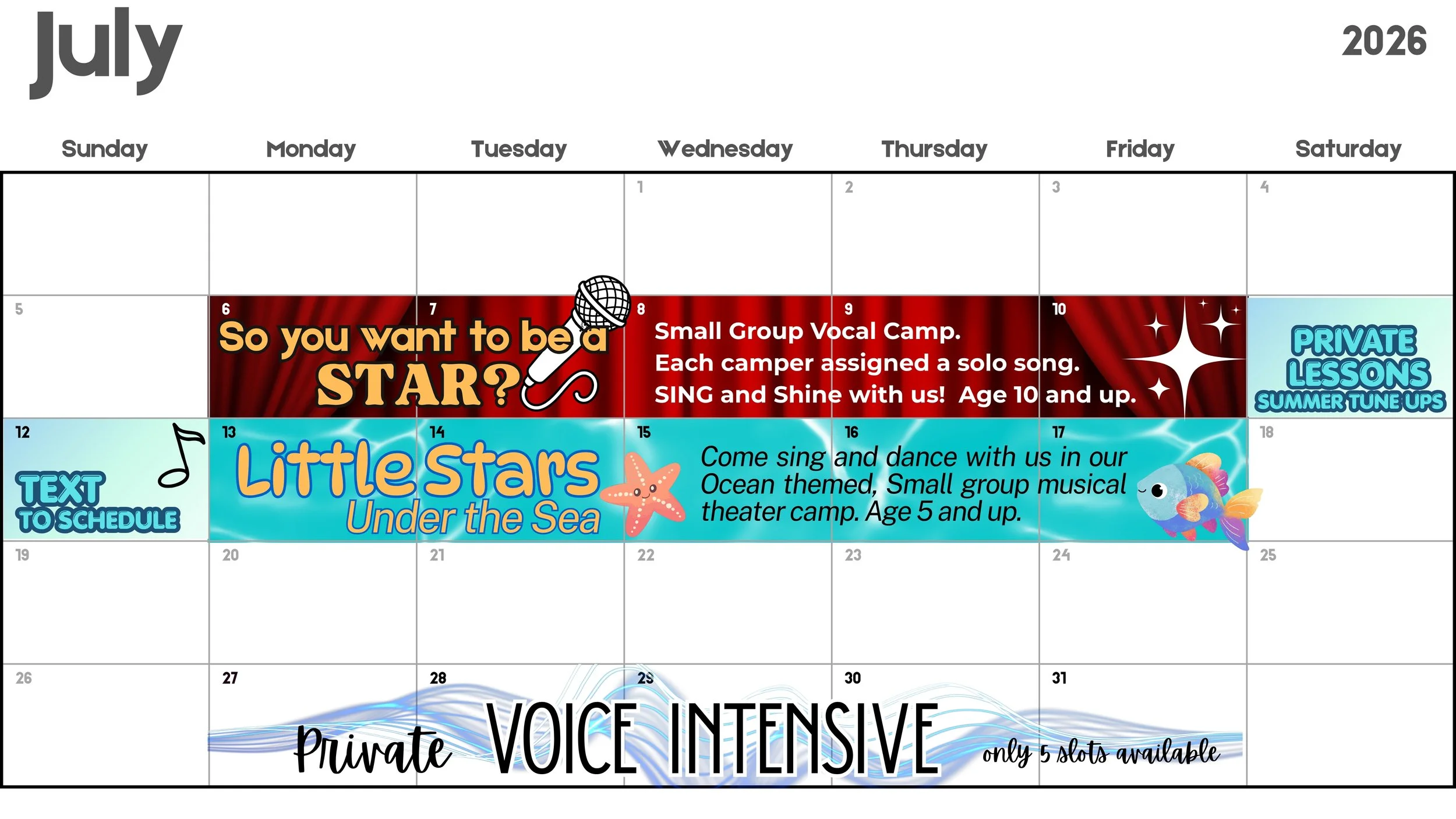 Come sing and dance with us under the sea, in our ocean themed, small group musical theater camp. This camp will feature an ocean themed Song and Dance number along with crafts, games and so much more. Our final day of camp will conclude with a performance at pick up!
