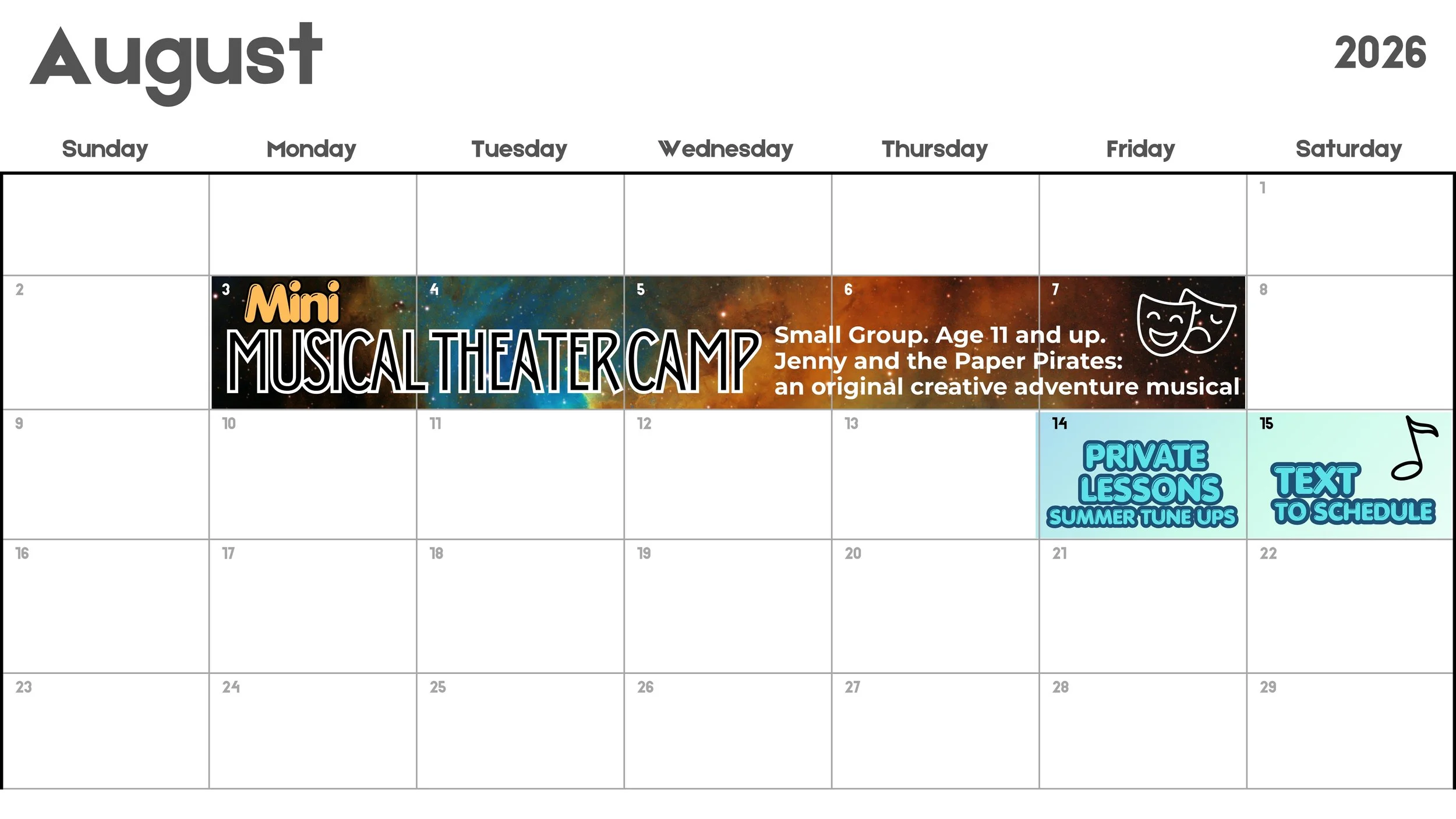 This is an offer for my advanced vocalist. Please reach out if you are unsure if you qualify. Each singer will meet with Jordan for a 1 hour private lesson Monday-Friday to workshop songs of their choosing.
